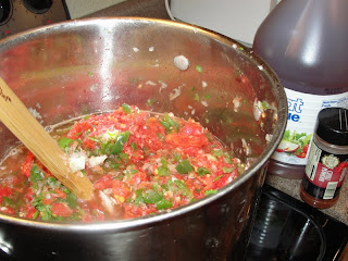 I bought a dozen jars at Walmart and scoured the internet for easy canning recipes. Thought I would try this recipe for salsa using our Romas and green peppers. I had to ask some ladies at the grocery store how in the heck you cut garlic--that's how ignorant I am--and they pointed me in the direction of jarred garlic. I bought one and threw them in the chopper, along with a few jalapenos. The jalapenos are something I would definitely leave out next time. Too spicy. I threw half of this mixture into another pot and added a few cans of crushed pineapple to sweeten it up a bit.