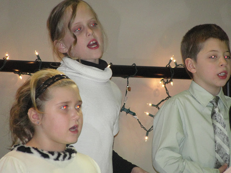 Cy's class was the oldest....and after subbing in there on several occasions, I have a special place in my heart for the fifth graders. They opened up with a jazzy spin-off of "Grandma Got Run Over By a Reindeer" called "Grandpa's Gonna Sue the Pants offa Santa". I know, not very sacred, but a fun tune to hear/watch! They acted it out with pizazz!